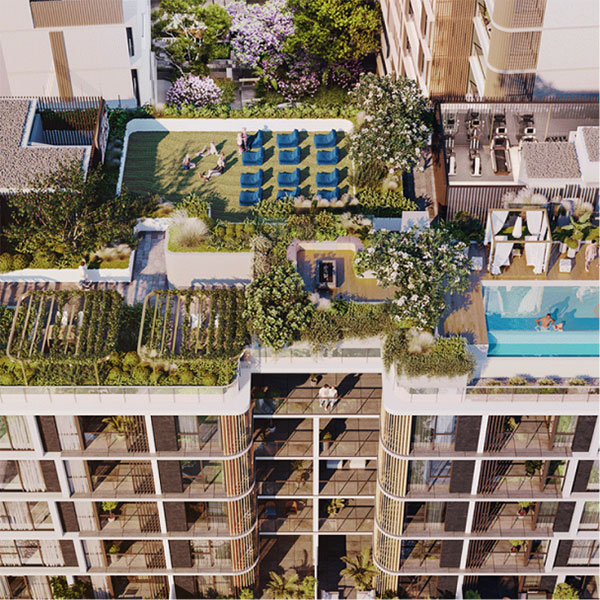 Screened by lush planting, Nautique’s communal rooftop terrace and pool looks north to the harbour – a place to soak up the sun among friends.